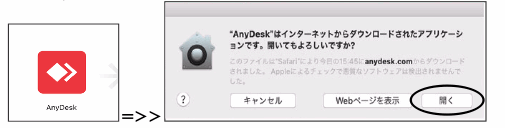 (4)「AnyDesk」アイコンをダブルクリックして起動します。起動後以下の確認画面が表示されますので「開く」ボタンをクリックします。