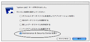 3.「BIZTREK_BackOffice2010」を再度起動(プログラムアイコンクリック後、すぐに)Mac→「opion 」キー , Win→「Alt」キーを押し続け、実行したい処理で「Maintenance&Security Centerを開く」を選択後実行し、データを「検証」→「圧縮」します。