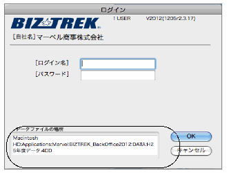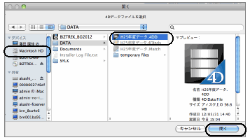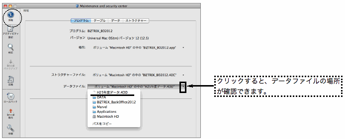 ※上記の例の場合、Macintosh HD→「アプリケーション」フォルダ→「Marvel」フォルダ→「BIZTREK_BackOffice2012」フォルダ→「DATA」フォルダ→「H25年度データ.4DD」ファイルを開いています。