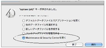 1.ハードディスク→「アプリケーション」フォルダ→「marvel」フォルダ→「BIZTREK_BackOffice2012」フォルダの中のプログラムアイコン 『BIZTREK_BO2012』を起動後、以下の画面が表示されるまで「option」キーを押し続けます。