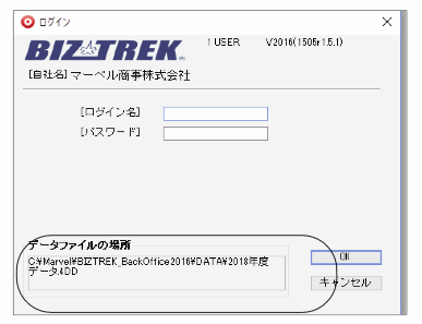 データファイルの保存場所が解らない場合は、「BIZTREK_BackOffice2016」をいつも通り起動し、ログイン画面を表示します。画面の左下に「データファイルの場所」が表示されています。