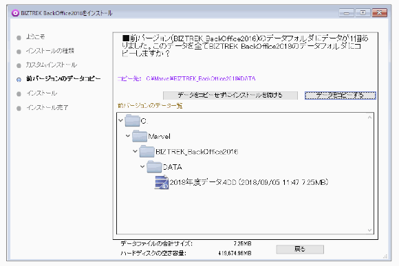 「BIZTREK BackOfficeV2018」をインストールする際、インストーラー上で、旧データのコピーが行えます。