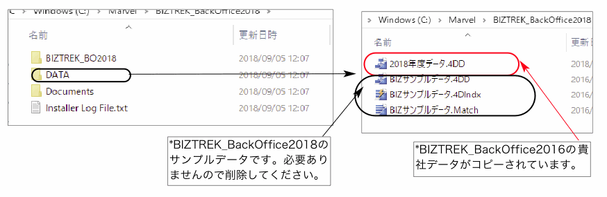 6.前バージョン「BIZTREK_BackOffice2016」フォルダ→「DATA」フォルダにある貴社データを、インストールして作成される「BIZTREK_BackOffice2018」フォルダ→「DATA」フォルダにコピーさせます。