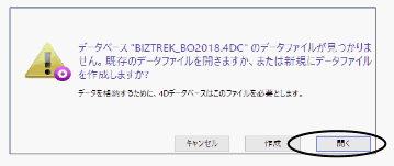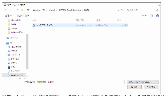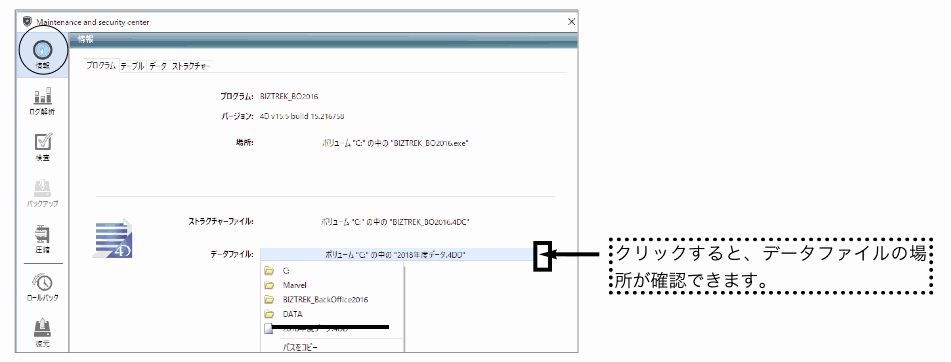 上記の例の場合、コンピュータ→Cドライブ→「Marvel」フォルダ→「BIZTREK_BackOffice2016」フォルダ→「DATA」フォルダ→「2018年度データ.4DD」ファイルを開いています。