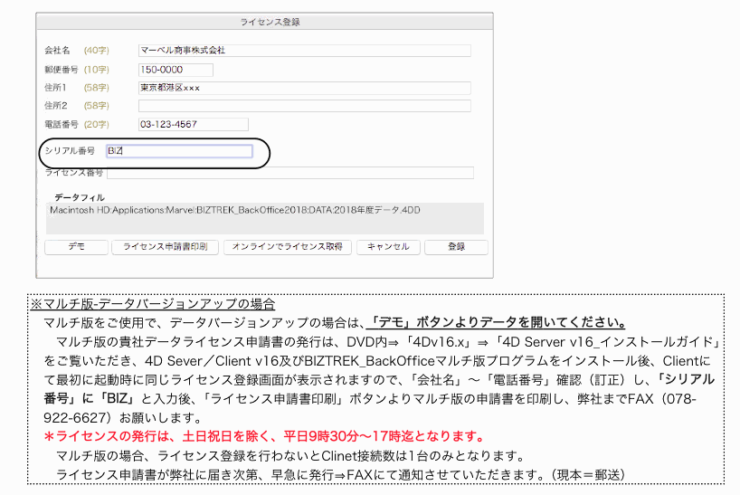 *貴社データのv2018用ライセンス(シリアル番号/ライセンス番号)入力→登録