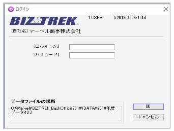6.プログラムが正しく開かれたかどうか確認するには、パスワード入力の画面か、起動後メニューバーに「BIZTREK_BO2018」が表示されている事で確認できます。