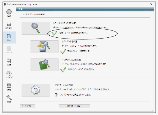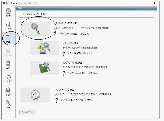 3.画面左の「検査」を選択します。→「レコードとインデックスを検証」を選択します。