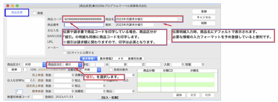 1商品に対する値引ではないため、こちらも摘要と同様に商品マスタに取引区分2=「値引」のマスタが必要です。