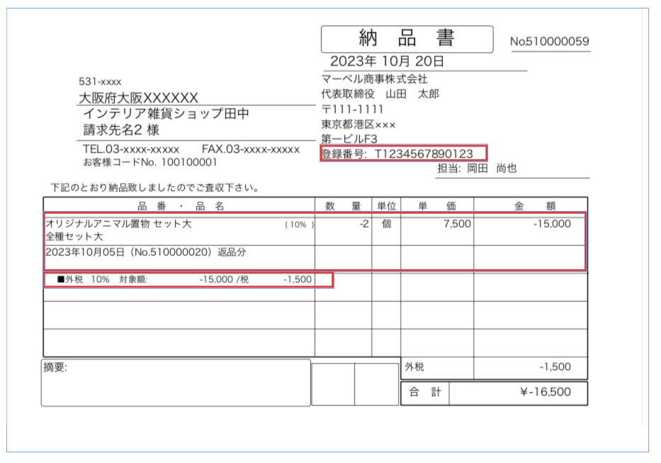 「納品書」「請求明細書」にて返品の返還インボイスを作成する例にて説明します。(外税額通知=「伝票毎」設定)