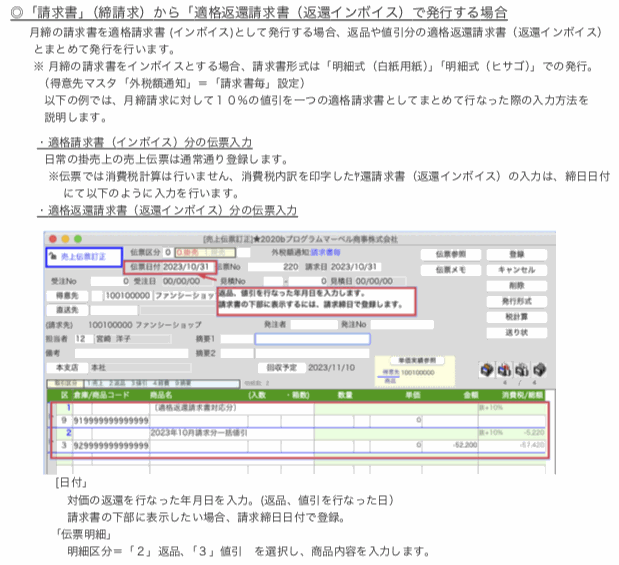○上記と同様に、月締の請求書にてまとめての値引として返還インボイスとする場合、売上伝票にて伝票明細入力時は、明細区分=「3.値引」での入力が必要となります。