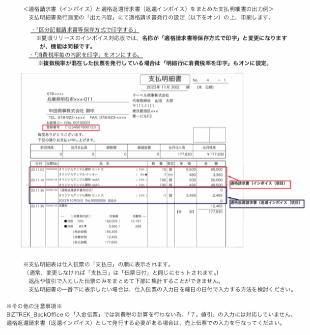 □BIZTREK_BackOfficeから発行する、適格返還請求書(返還インボイス)は以下が確認できるように入力の上、適格請求書保存方式による請求書、納品書(請求明細書)等